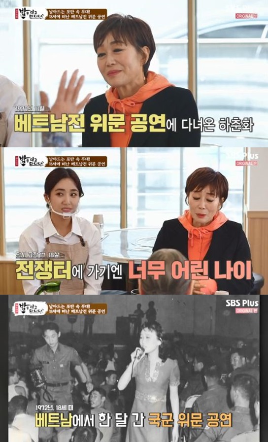하춘화는 "당시 월남에서 한 달 간 있었다"며 "비둘기, 백마, 청룡 부대 다 다니면서 공연을 했다. 공연을 하면서도 포탄 소리가 멀리서 들렸다. 새벽이면 포탄 소리가 들려서 자다가 깨어나기도 했다. '걱정하지 말라'고 안심시키는데도 무섭더라"고 털어놨다.