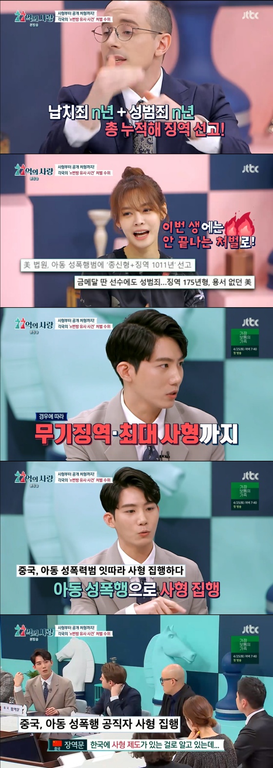 이어 장역문은 "중국은 사형이 빈번이 일어난다. 한국도 사형제도가 있는 걸로 아는데, 왜 사형을 시키지 않는지 모르겠다"며 의아해 했다. 또한, "아동 7명을 성폭행한 초등학교 교사가 사형됐고, 아동 11명 성폭행한 공무원도 사형됐다"며 중국의 아동 성범죄 형량을 밝혔다.