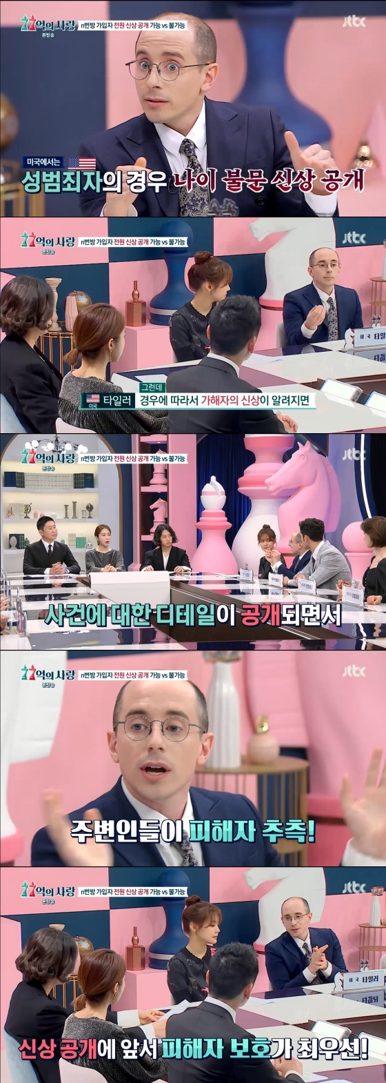 13일 오후 방송된 JTBC 예능 프로그램 '77억의 사랑'에서는 최근 이슈가 된 'n번방 유사 사건'에 대한 처벌 수위에 대해 토론했다.