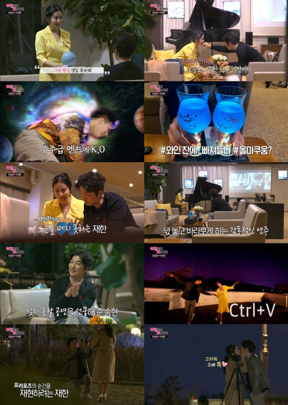 최송현은 '라라랜드' OST를 피아노로 직접 연주, 완벽한 이벤트를 선물했다. 이재한은 "이렇게 행복해도 되는지 모르겠다"며 벅찬 감동을 전했다. 이재한 역시 프러포즈의 순간을 재연하며 최송현에게 팔찌를 선물, 천생연분 커플다운 훈훈함을 자아냈다.