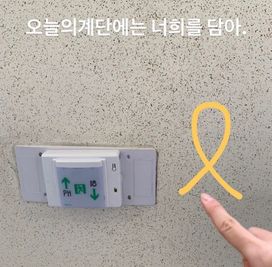 공개된 사진 속에는 계단 비상구 표시를 가리키고 있는 이윤지의 손가락이 담겨있다. 이윤지는 해당 사진에 '오늘의 계단에는 너희를 담아'라는 글과 함께 노란 리본을 그렸다.