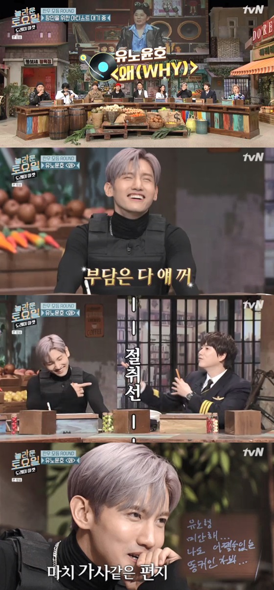 최강창민은 함께 동방신기로 활동하는 유노윤호의 곡이 나오자 가시방석에 앉은 듯 안절부절하지 못했다. 반면 '놀토' 멤버들은 최강창민을 보며 "믿고 가겠다"며 신뢰를 나타냈다. 하지만 최강창민은 결국 첫 받아쓰기에서 가사를 다 받아적지 못하고 "유노형 미안해"라며 귀여운 사과를 전했다.