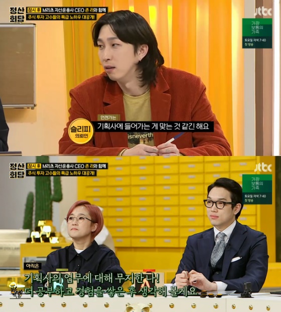 21일 오후 방송된 종합편성채널 JTBC 예능프로그램 '정산회담'에서는 의뢰인으로 슬리피가 출연했다. 연예계 산전수전 계보로 얽히는 대선배 김종민과 파산 전문 변호사 고승우가 스페셜 돈반자로 참여해 안건을 해결하는 데 도움을 줬다.