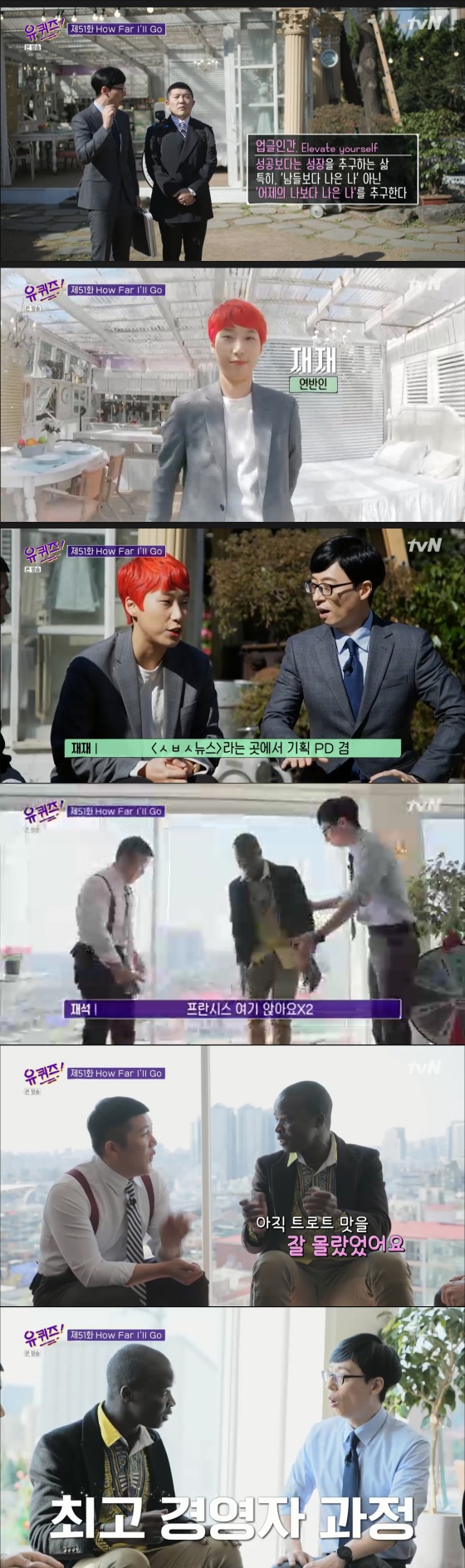 22일 오후 방송된 tvN 예능프로그램 '유 퀴즈 온 더 블럭'에서는 SBS '스뉴스' PD로서 직장인 생활을 하며 유튜브를 통해 큰 인기를 얻은 '연반인' 재재, 국가대표 배구선수 이재영과 이다영, 디자이너 장명숙이 출연해 '업글인간' 특집으로 꾸며졌다.