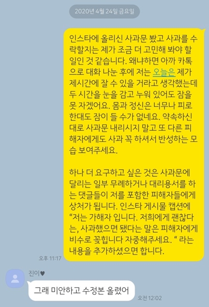 이는 1차 사과문 당시 "사실 여부를 떠나 저의 행동으로 인해 상처를 받았던 피해자 분들께 죄송하다"라고 밝혔던 것과 달리, 자신의 잘못을 모두 인정한 것.