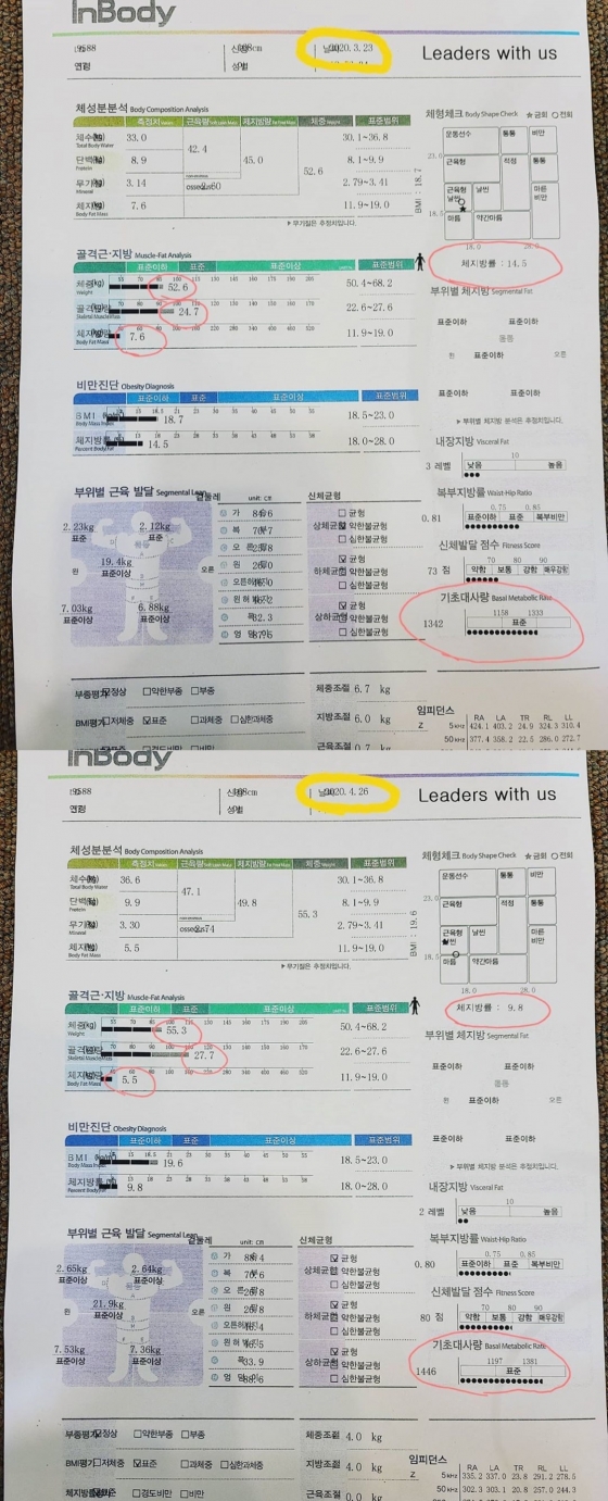 공개된 사진은 '인바디' 검사 결과지로 이시영은 52.6kg에서 55.3kg이 됐다. 하지만 지방은 7.6kg에서 5.5kg으로 감량해 근육이 증량했다는 사실을 밝혔다. 그의 체지방률은 14.5%에서 9.8%가 되며 완벽한 성공을 이루었다.
