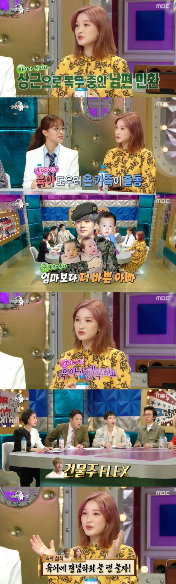 율희는 '남편 최민환이 군 복무 중이라 독박육아를 하는 게 아니냐'는 질문에 "아이가 셋이라 남편이 상근 출퇴근을 하며 나보다 더 육아를 한다"며 "시어머니, 친정어머니, 여동생까지 와서 육아를 같이 한다. 친정 식구들은 인천에 사는데 와주시고 시댁과 같은 건물 다른 층에 산다. 아가씨는 스튜어디스인데 한 달 휴가를 내서 육아를 같이 해주고 있다"고 전했다.