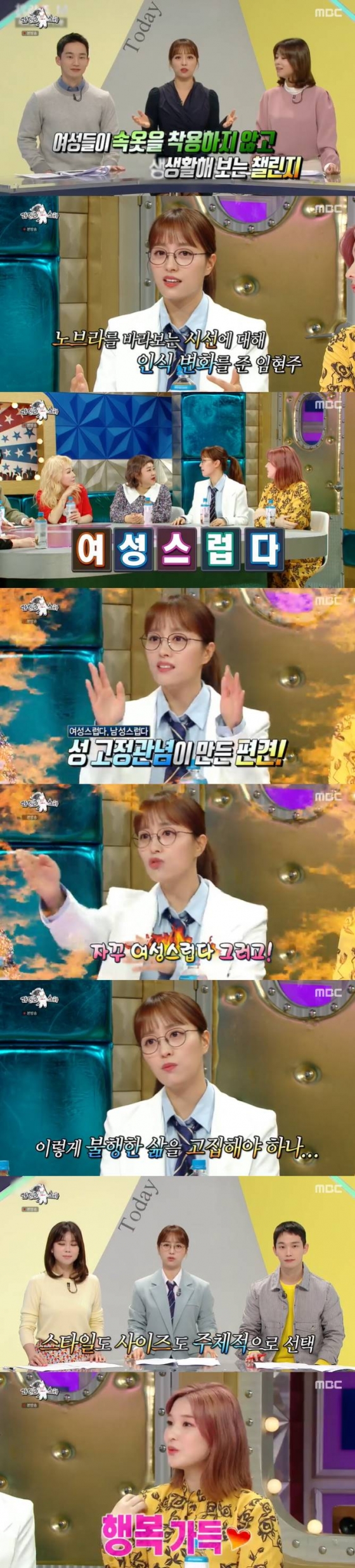 하고싶은 말을 못할 때 제일 못참는다는 임현주는 "아까도 하고싶은 말이 많았다. 계속 거슬린 말이 있었다. '여성스럽다'는 말을 왜이렇게 많이 하느냐. 요즘 '여성스럽다, 남성스럽다'는 말을 하면 안된다. 그게 편견을 만든다. '너답다, 매력있다'고 하면 된다"고 잘못된 성 고정관념을 지적했다. MBTI에서 '정의로운 사회운동가'가 나왔다는 그는 "총대매는 스타일이다. 할 말을 해야해서 일기를 자주 쓴다"고 밝혔다.
