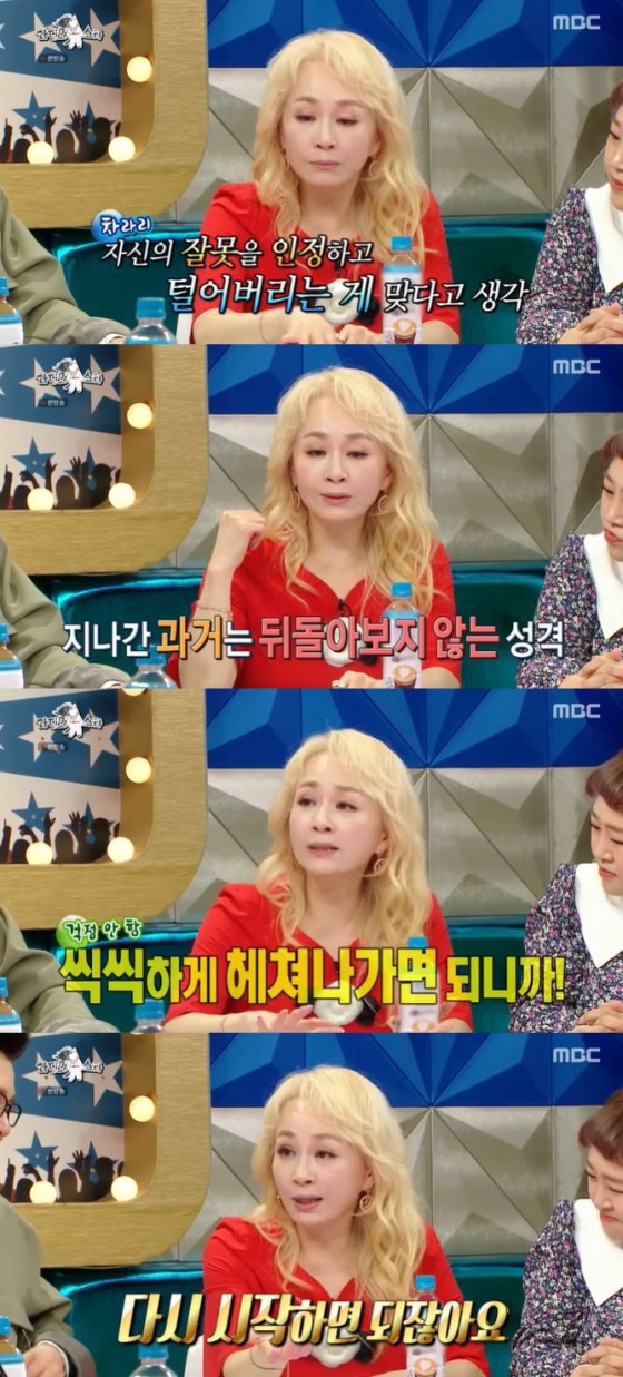 전 남편의 사건과 이혼까지 최근 힘든 일을 겪은 박해미는 "결과적으로 내 탓이라 생각한다. 남을 탓하는 순간 모든 게 힘들어진다. 원래 내 스타일이 과거를 돌아보지 않고 '카르페 디엠'이다. 현재를 즐기고 앞을 바라본다"며 "지금 돈이 하나도 없고 마이너스인데 미래가 좋다. 아직도 돈을 줘야 할 곳이 많고 책임질 게 많다. 마무리하는 과정인데 전혀 아파하지 않는다. 능력 있잖아요. 다시 시작하면 된다"라고 털어놨다.