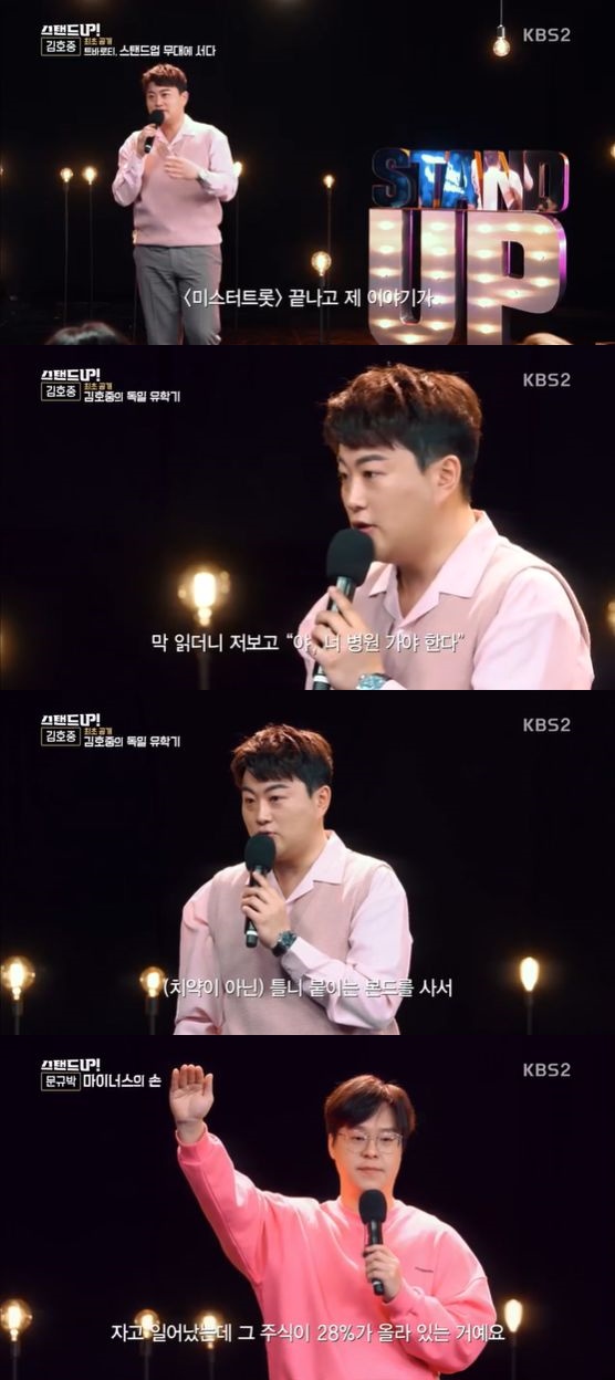 5일 오후 방송된 KBS 2TV 코미디 쇼 '스탠드 업'에서는 '미스터 트롯'으로 이미 모르는 사람이 없게 된 트롯맨 김호중이 그동안의 이야기와는 사뭇 다른 독일 유학 당시의 에피소드를 공개했다.