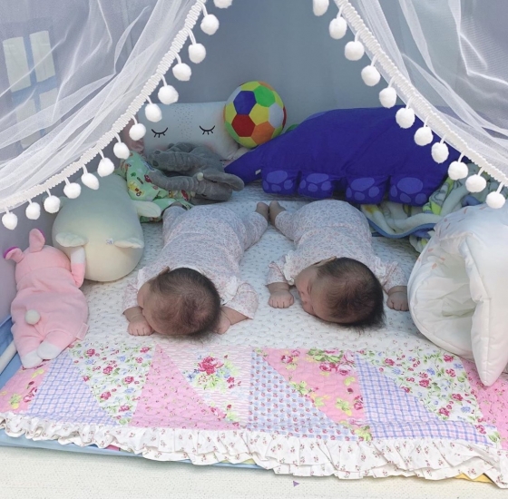 공개된 사진 속에는 나란히 엎드려 있는 쌍둥이의 모습이 담겨있다.