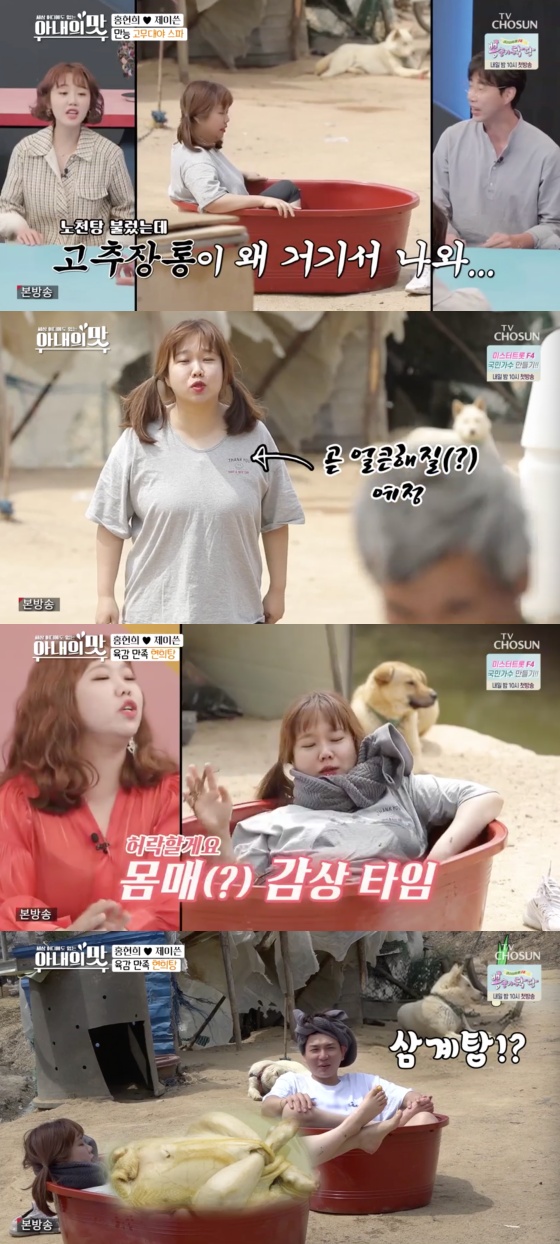 12일 오후 방송된 TV조선 예능 프로그램 '아내의 맛'에서 홍현희와 제이쓴은 고추장 대야 노천탕을 즐겼다.