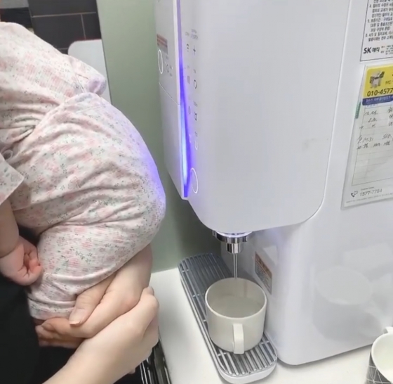 공개된 영상 속에는 '또둥이' 중 한 아이를 안은 채 아이의 엉덩이로 정수기 버튼을 누르는 모습이 담겨있다.