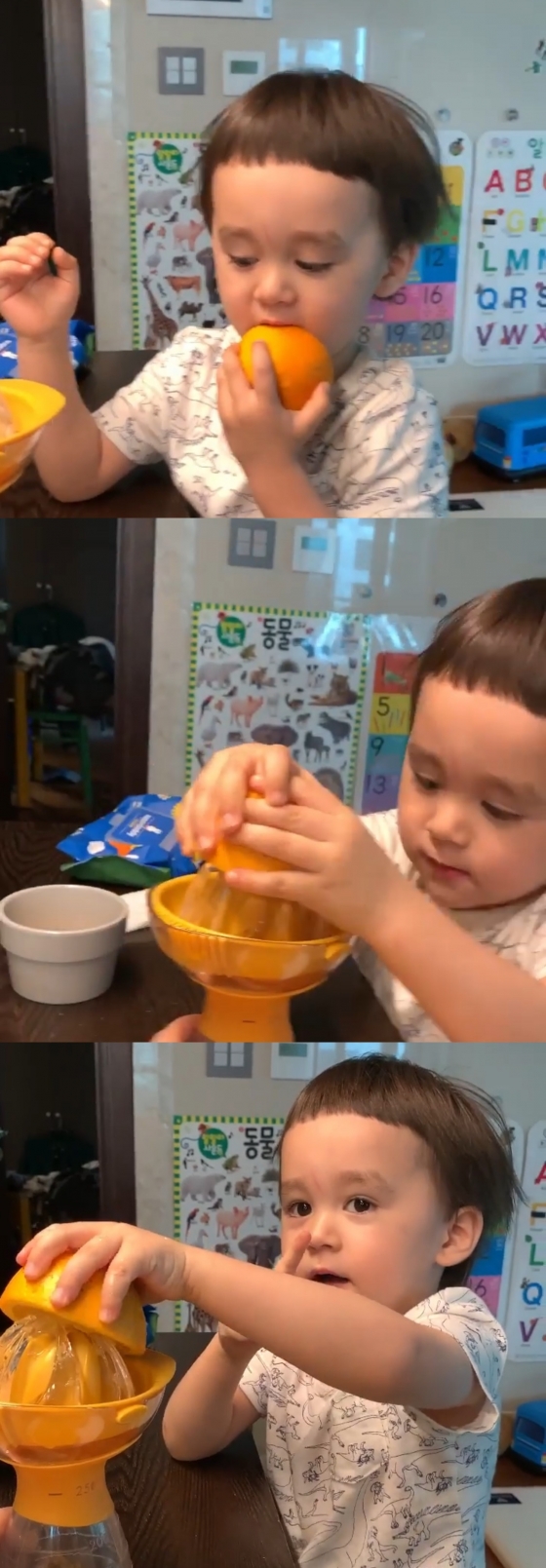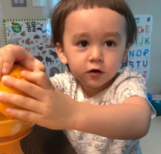 공개된 영상 속 벤틀리는 오렌지를 입으로 가져가 핥고 있는 모습이다. 이에 엄마는 "아니 주스 만들어야지. 여기 대고 누르세요. 딱 눌러서 돌려주세요"라고 얘기했다.