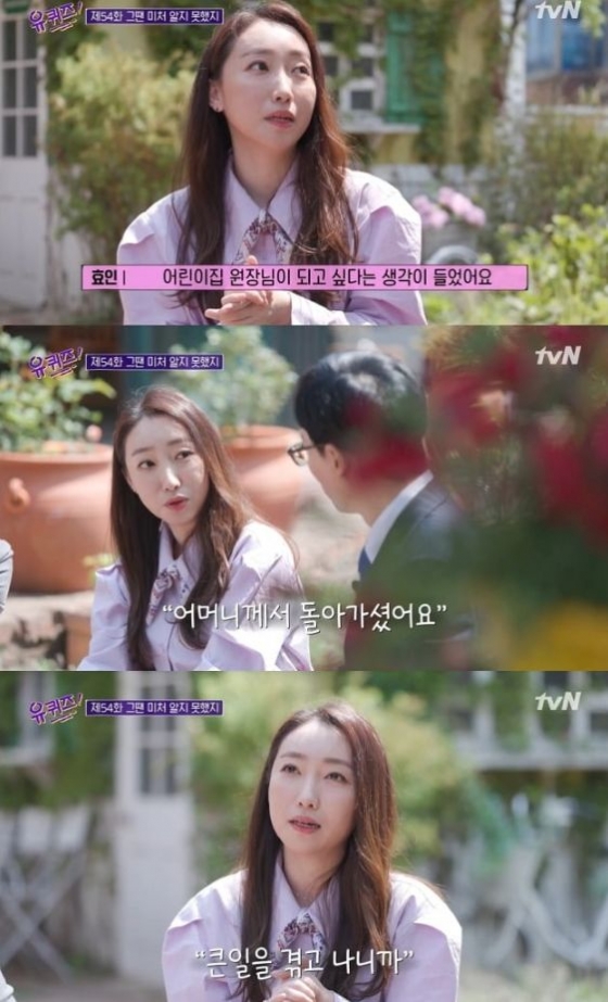 또한 장효인은 유치원 보조교사를 시작하게 된 계기도 밝혔다. 장효인은 "어머니가 돌아가셨다. 큰일을 겪고 나니까 웃음을 드려야 하는 직업인데 마음이 힘들더라. 그러다 보니 1년 넘게 칩거를 했다"며 "엄마의 빈자리가 자꾸 보였다"고 털어놨다.