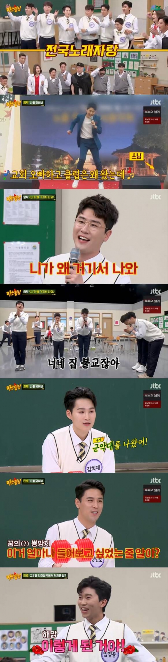 장민호는 "몇 개월 전만해도 시청하던 프로그램인데 '아형'에 나오다니. 뿅망치 얼마나 들어보고 싶었는데"라고 감격하며 자신이 고3 때 지하철 역에서 저지른 일을 털어놨다. 임영웅은 "화장실이 너무 급해서 변기 위에 앉았는데 변기 뚜껑이 닫힌 채로 볼일을 봤다"고 답해 폭소를 자아냈다. 급기야 "고3 때 받은 엿으로 뒤처리를 했다"는 답이 나왔고, 김호중이 "찹쌀떡으로 해결했다"고 말해 답을 맞췄다. 장민호는 "찹쌀떡의 흰 가루로 분처럼 바르고 말끔하게 없었던 일처럼 해결했다"고 자랑했다.