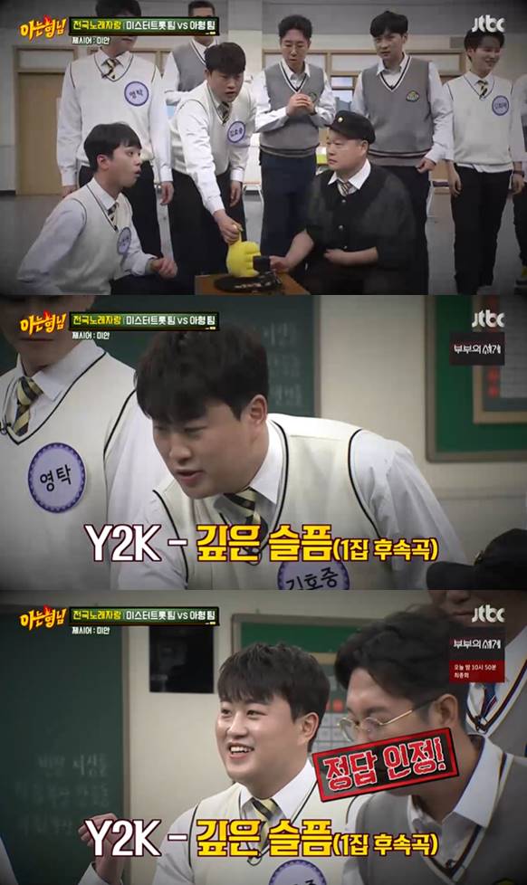 이에 김호중은 Y2K의 '깊은 슬픔'을 불렀다. 김호중은 Y2K 유이치가 "미안해 숨어있는~"이라 부르며 음이탈이 난 이후 "미안해!"라고 애드리브를 한 모습을 능청스레 재현해 웃음을 자아냈다.