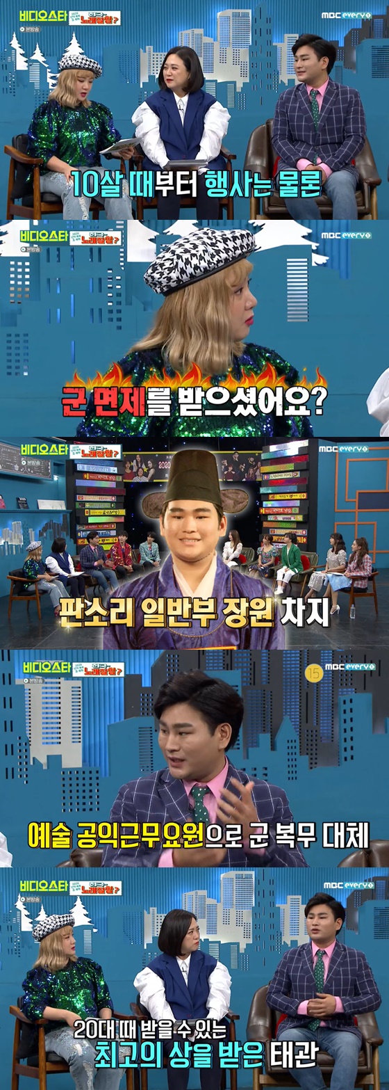 이에 앞서 박나래는 강태관에 대해 "10살 때부터 행사는 물론 각종 대회까지 씹어먹었다. 1등 특전으로 군 면제를 받았다"며 놀라워했다. 이에 강태관은 "2010년에 열린 전주대사습놀이에서 일반부 1등을 해서 군 면제 혜택을 받았다. 완전히 군대를 안가는 건 아니고 '예술 공익근무요원'이라고 3년간 공연으로 군 복무를 대체 했다"고 밝혔다.