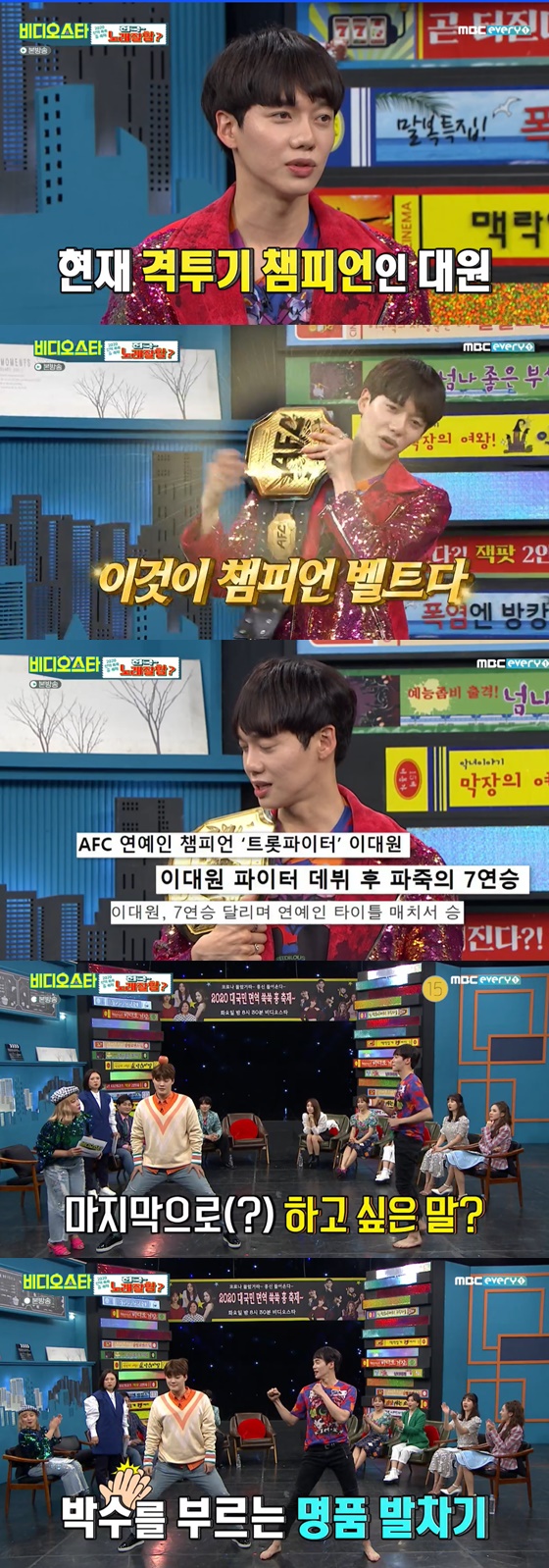 이대원은 "현재 격투기 챔피언이라 벨트를 들고 왔다"며 7전 7승 후 받은 벨트를 보여주며 "지금까지 진 적이 없다. 미스터트롯 예선 8일 전에 방어전을 했다. 예선전 때 이미 피멍이 다 들어 있었다. 그래도 챔피언 벨트라도 없으면 아무런 타이틀이 없을 것 같아 탈고된 어깨는 스스로 끼워 맞춰서 경기에 참가했다"며 7전 무패담을 털어놓아 주위를 놀라게 했다.