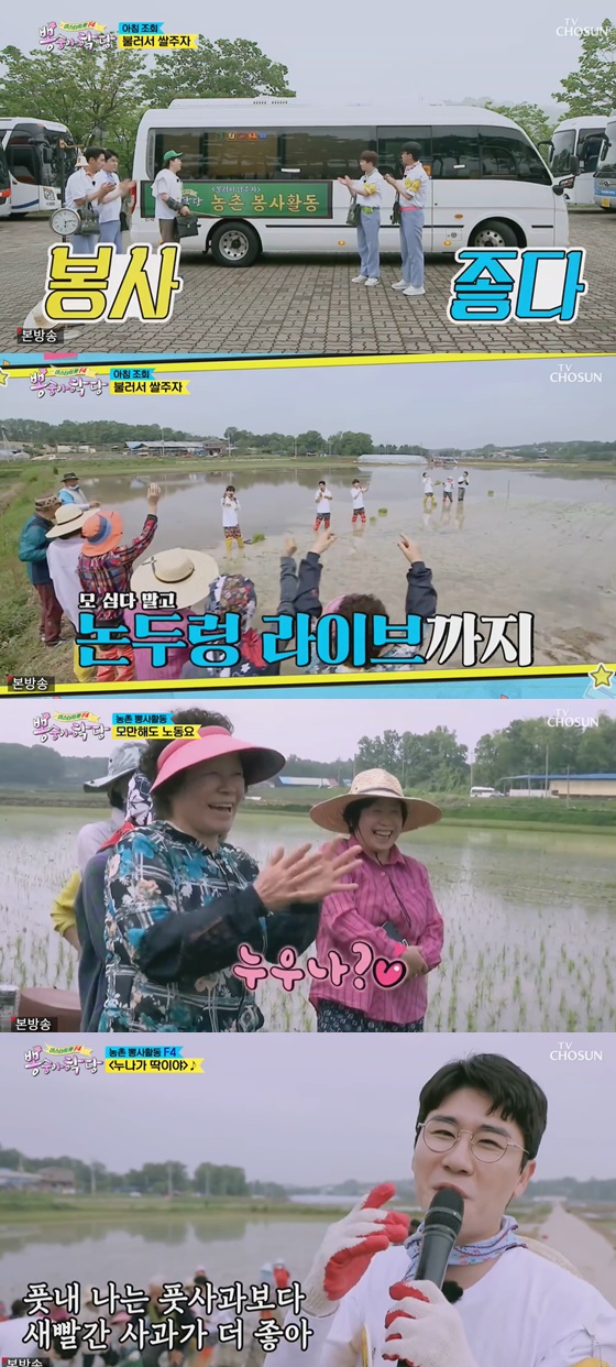 27일 오후 방송된 TV조선 예능프로그램 '뽕숭아학당'에서는 붐 선생과 F4(임영웅, 정민호, 이찬원, 영탁)가 경기도 이천의 모내기 농가를 찾아 부족한 일손을 도왔다.