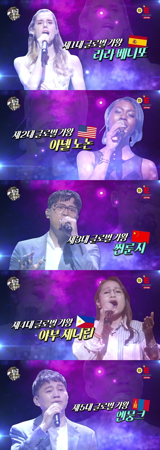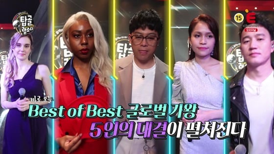5일 E채널에 따르면 오는 6일 방송되는 E채널 '탑골 랩소디: 케이팝도 통역이 되나요' 6회에는 매회 배출된 우승자인 1~5대 글로벌 가왕들의 치열한 혈투를 담을 예정이다.