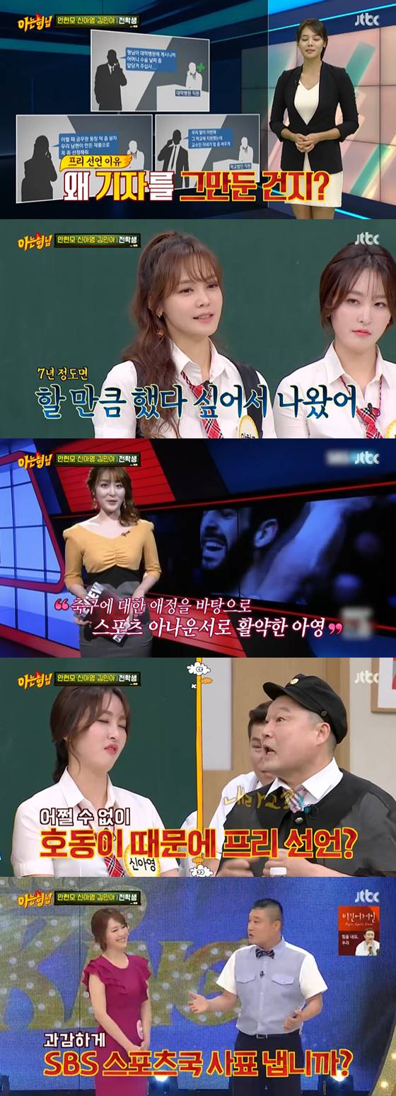 스포츠 아나운서 출신 신아영은 "스포츠 외에 다른 활동도 해보고 싶었다. (김)민아처럼 타의도 있었다. 프리를 (강)호동이 때문에 어쩔 수 없이 하게됐다"며 "아나운서를 할 때 '스타킹'을 나갔다. 초등학교 때 꿈이 뮤지컬 배우여서 뮤지컬 편에 나갔다. 그런데 호동이가 '뮤지컬 배우가 되면 아나운서 그만할 겁니까'라고 묻더라"고 했다.