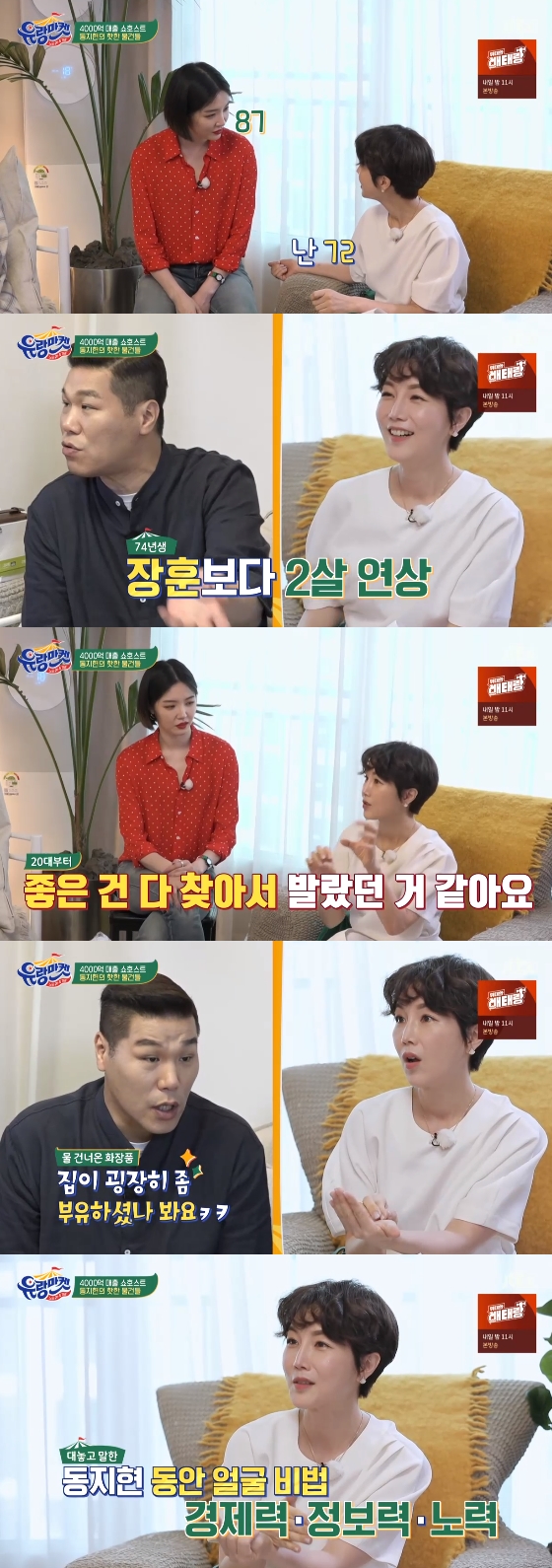 72년생이라는 동지현의 말에 MC들은 놀라움을 감추지 못했다. 동지현은 "어렸을 때부터 아토피였어요. 그래서 20대부터 좋은 건 다 찾아서 발랐던 것 같아요. 한국에 잘 없을 때부터 자외선 차단제도 바르고"라며 비법을 밝혔다.
