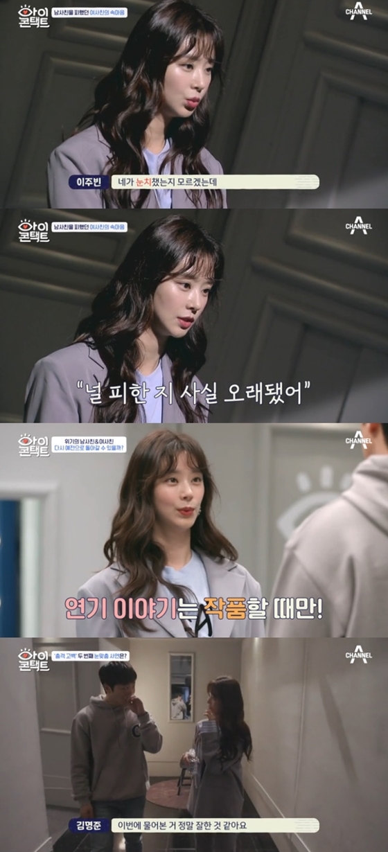 이날 방송에서 김명준은 이주빈에게 "일주일에 다섯 번 정도 만났는데 요즘은 부쩍 소원해진 것 같다. 무슨 일 있냐"고 물으며 '아이콘택트' 출연 이유를 밝혔다. 이에 이주빈은 "너가 느꼈을지도 모르겠지만 널 살짝 피했다"고 답하며 사연을 털어놨다.