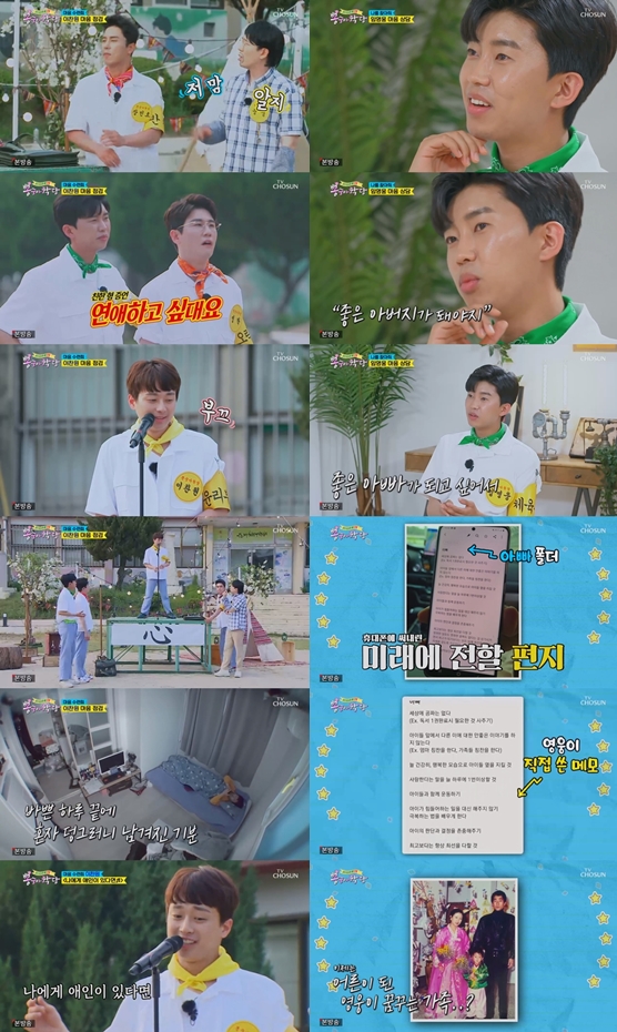 임영웅은 "제가 결혼 생각은 많이 안 해봤는데, 좋은 아빠가 되고 싶다는 생각은 맣이 했다"라며 "좋은 아빠가 되고 싶어서 아이에게 좋은 교육이 될 만한 것들을 적어 둔다"라고 말했다. 실제 임영웅은 좋은 아빠가 되기 위해 생각날 때마다 써놓은 조언과 글귀들을 담은 휴대폰 속 메모를 공개했다.