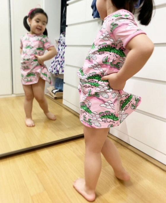 이윤지는 지난 14일 자신의 인스타그램에 "#오동통내너구리 #라니 오늘 아침, 새로운 발언을 했어요. 언제까지나 긴 치마, 긴 드레스만 찾을 것 같던 공주 삼매경에서 벗어나려는지. 더워서 자연스러운건지. #7세언니되면취향바뀐다는데정말인가봉가 '엄마 이렇게 말야 이렇게 올라가니까 예뻐. 지금 딱 좋아 그치?' #야야야 #너무짧아 #이센치만내려 #나중에 교복 접어 입는 거 아닌지"라는 글과 함께 사진 한 장을 게재했다.