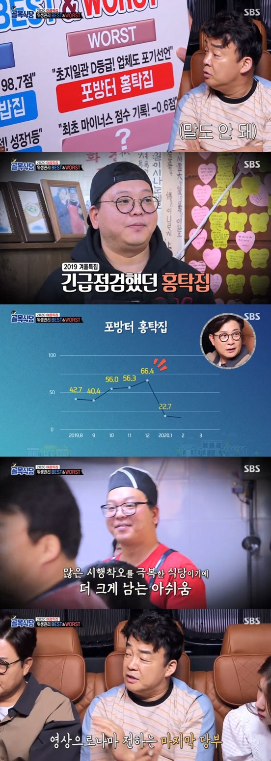 지난 17일 오후 방송된 '백종원의 골목식당'은 '2020 여름특집'을 맞아 그동안 요리 연구가 백종원의 솔루션을 받았던 가게들 가운데 위생관리 '베스트-워스트'(BEST&WORST)를 공개했다. 워스트 식당 중 하나는 위생관리 업체 세스코의 점수를 토대로 홍탁집이 꼽혔다.