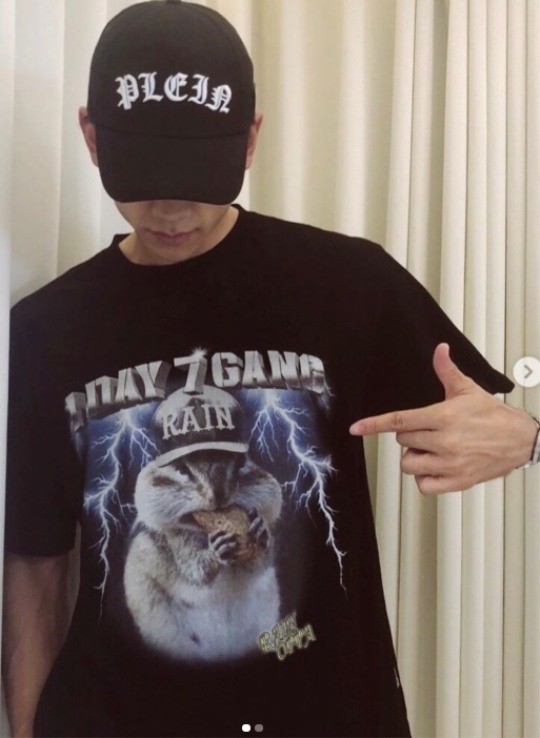 공개된 사진 속 비는 '1DAY 7GANG(1일 7깡)'이라는 글귀가 적혀 있는 다람쥐 티셔츠를 입고 포즈를 취하고 있다. 최근 자신의 노래 '깡' 가사 중 일부가 '한국 다람쥐'로 들린다는 네티즌들에게 유쾌히 응답하며 직접 다람쥐 티셔츠까지 제작하는 비의 모습이 눈길을 끈다.