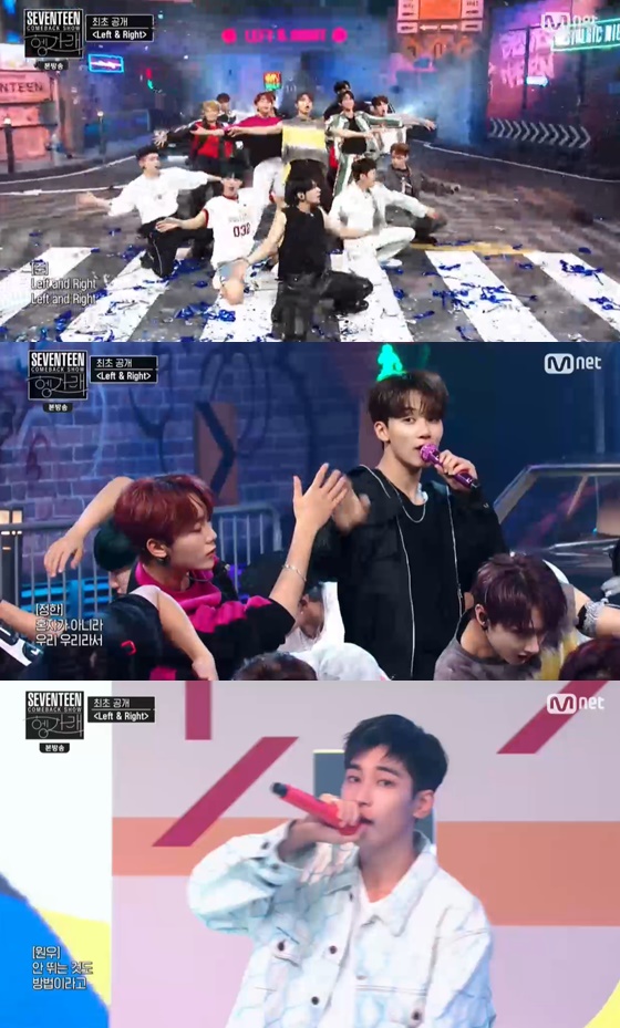 22일 오후 방영된 Mnet 예능프로그램, 세븐틴 컴백쇼 '헹가래'에서 세븐틴이 타이틀곡 'Left&Right'무대를 최초로 공개했다.