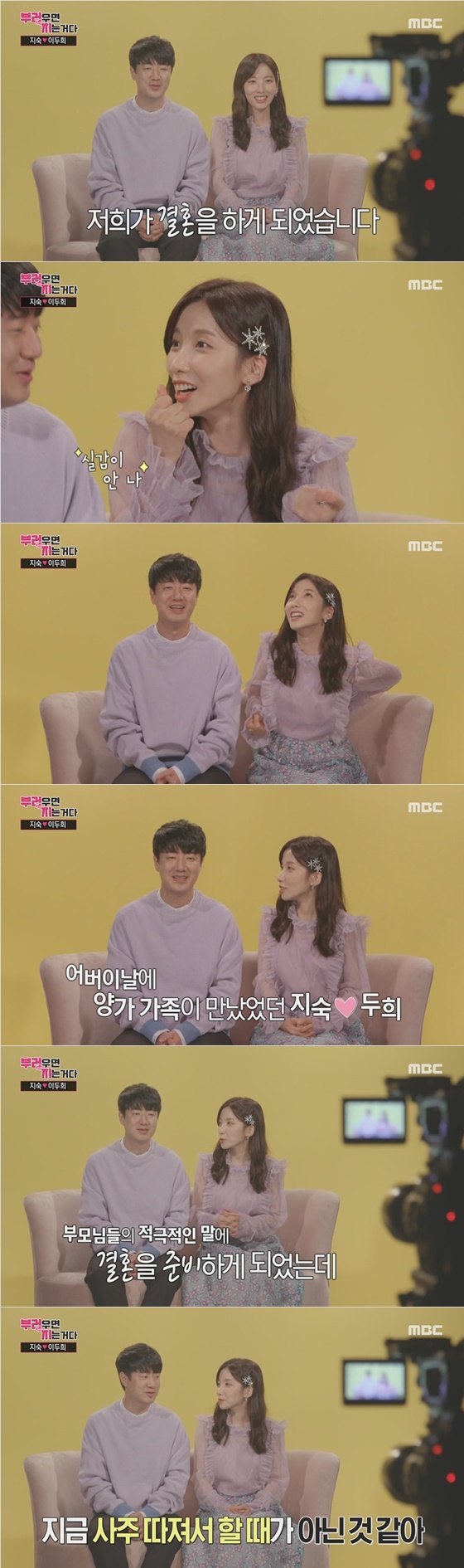 지숙은 지난 29일 오후 방송된 MBC 예능프로그램 '부러우면 지는거다'에서 이두희와 결혼을 발표하는 모습이 그려졌다.