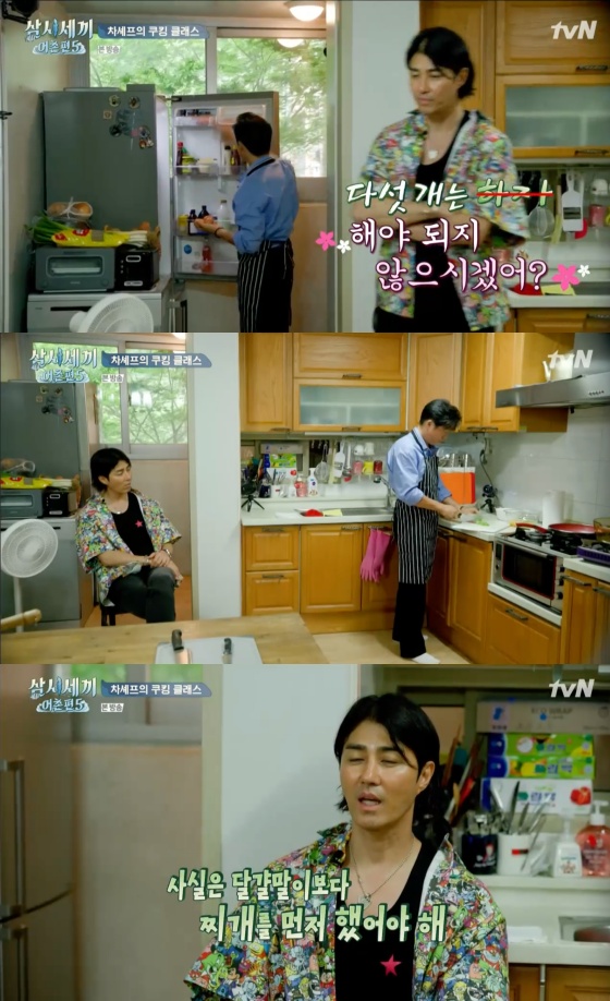 갈팡질팡하는 유해진을 보던 차승원은 결국 입을 열었다. 차승원은 "계란말이보다 찌개를 먼저 했어야 해. 그리고 이미 채소를 갖고 왔잖아. 그러니까 다 썰어놓고 한 번에 하는 거지"라고 말하며 폭풍 지도를 이어갔다.