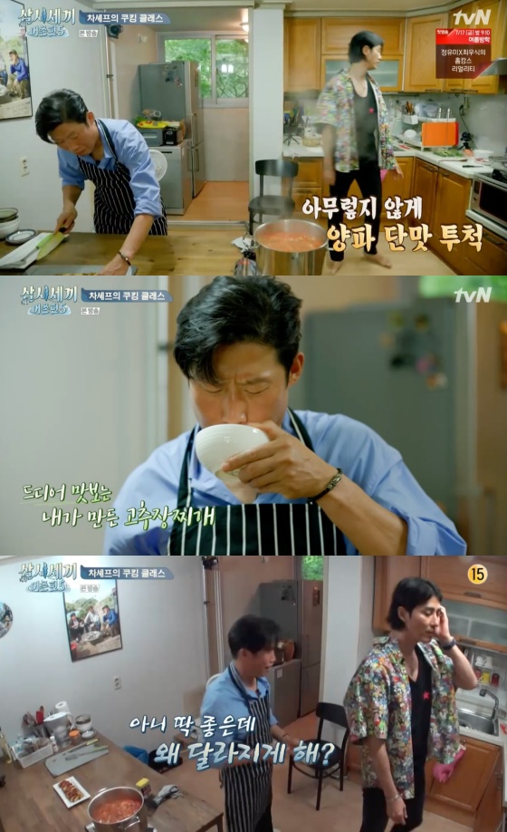 차승원은 유해진이 계란말이를 썰 때 고추장 찌개의 간을 봤다. 차승원은 "설탕을 더 넣어야 해"라며 양파를 썰어 넣었다. 제작진은 계속해서 재료를 추가하는 차승원에게 "본인 요리가 아니잖아요"라며 차승원을 말렸다. 유해진은 "내가 이걸 하고 있으니까"라며 웃었다.