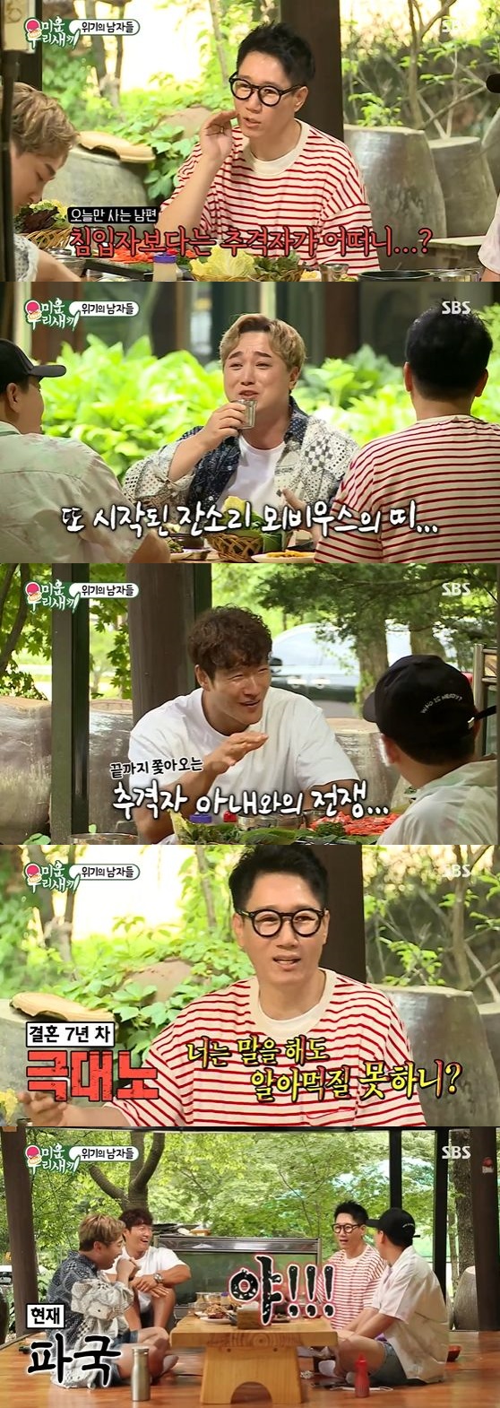 지석진은 "아내가 신혼, 결혼 3년 차, 5년 차에 따라 태도가 달라진다"라며 이어 "신혼 때는 상냥하게 말하고 이후 점점 불만에 따라 나중에는 폭발하더라"라고 말해 웃음을 더했다. 이어 "컵을 두는 자리도 내가 정하면 안 된다. 아내가 두는 자리가 정해져 있다. 추격자라고 생각하면 된다"라고 농담했고 이에 황제성은 공감하며 폭소했다.
