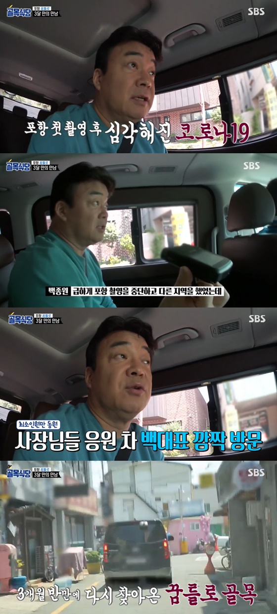 15일 오후 방송된 SBS 예능프로그램 '백종원의 골목식당'에서는 신종 코로나 바이러스 감염증(코로나 19)으로 촬영을 중단했던 포항 꿈틀로를 재방문하는 백종원의 모습이 그려졌다.