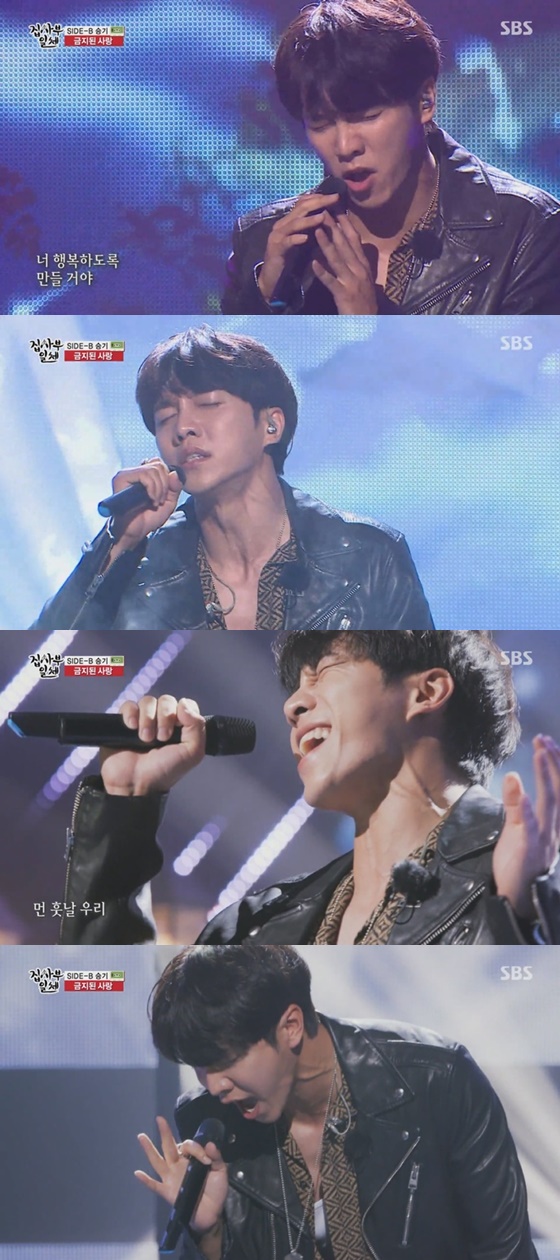 이승기는 지난 19일 오후 방송된 '집사부일체'에서 가수 김경호의 곡 '금지된 사랑'을 열창했다. 그는 신성록과 함께 '허리케인 나초' 팀을 결성해 한 편의 뮤지컬처럼 스토리 있는 무대를 선보였다.