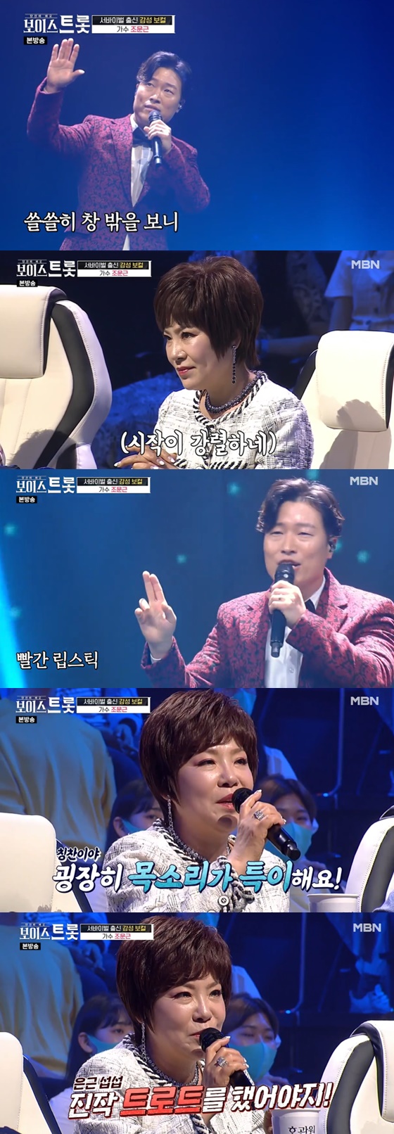 31일 오후 방송된 MBN 예능프로그램 '보이스트롯'에서는 가수 조문근이 심사위원 김연자의 극찬을 받았다.
