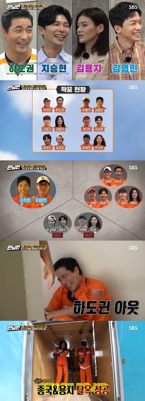 9일 오후 방송된 SBS 예능프로그램 '런닝맨'에서는 '탈옥 레이스' 편으로 배우 김영민, 하도권, 지승현, 김용지가 등장해, 서로의 짝꿍을 찾아 탈옥하려는 멤버들의 두뇌싸움이 그려졌다.
