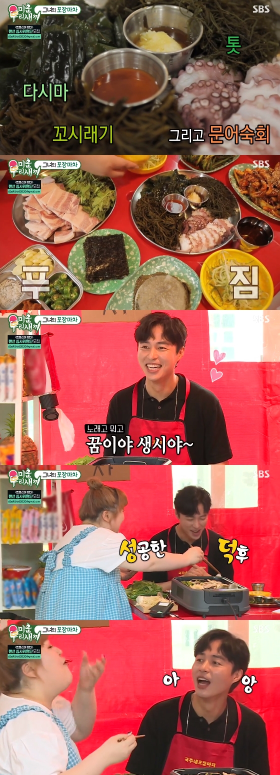 오민석은 등장부터 이국주에게 해바라기 꽃다발을 건네며 팬임을 드러냈다. 이국주는 국주 포차에 이들을 초대해 문어와 톳, 다시마, 꼬시래기, 삼겹살 등으로 한 상을 차려 놀라움을 자아냈다.