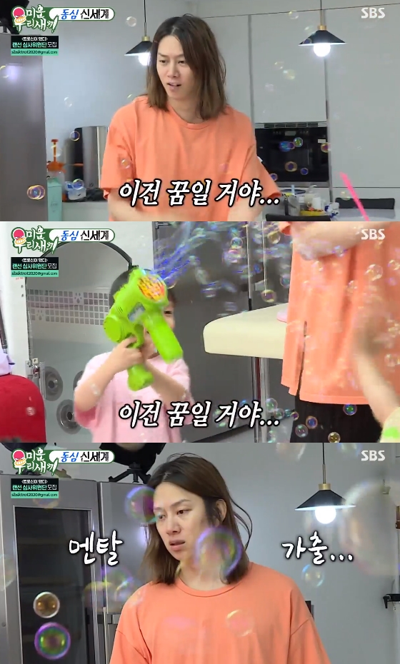 아이와 동물한테만 관대하다던 김희철은 두 아이와 함께 첫 만남을 축하하는 케이크의 촛불을 불고 장난감을 만들어주며 노력하는 모습을 보였다. 하지만 김희철이 만들어준 장난감은 무려 버블건이었다. 김희철은 아이들이 비눗방울을 불기 시작하자 "어머 비눗방울이 너무 커서 물이.. 물이 다"라며 주방으로 고개를 돌렸다.