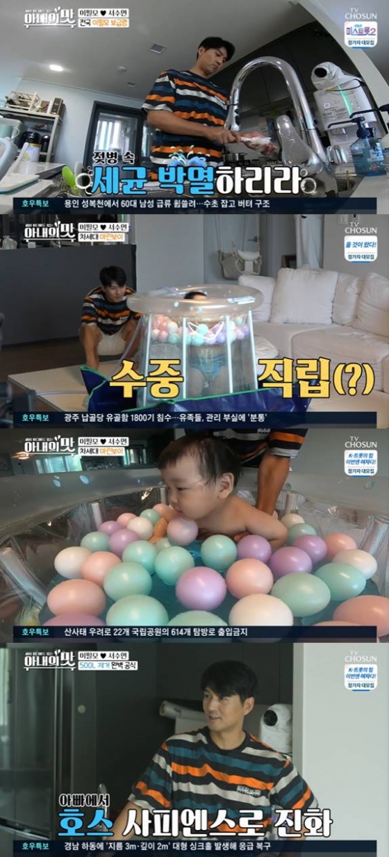 이날 이필모는 아이 담호를 위해 직접 젖병을 세척하는가 하면, 거실에 미니풀을 만들었다.