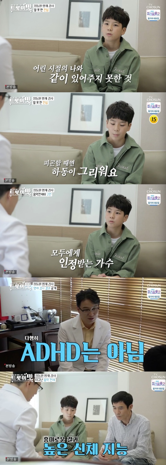 정동원은 ADHD 검사를 받기도 했다. 정동원의 아버지가 산만한 정동원을 걱정하며 검사받게 한 것. 노규식 박사는 "ADHD는 아니다. 산만하지만 충동적이지는 않다. 주의력이 약한 사람 중에 창의적인 사람이 많다. 산만한 사람들은 땅속에 묻힌 보석이다. 앞으로 음악 할 때 잘만 다루면 좋은 결과를 낼 수 있다"고 말했다.