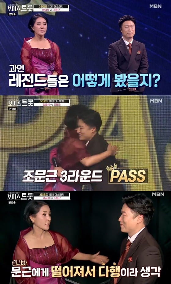 1대1 데스매치답게 퍼포먼스보다는 참가자 개인의 노래 실력에 포커스를 두고 심사가 이루어졌다. 이날 가장 심사위원들의 극찬을 받은 참가자는 조문근. 배우 양금석과 대결을 펼친 조문근은 '명품 보이스'의 소유자답게 안정적인 보이스로 무대를 이어나갔다.