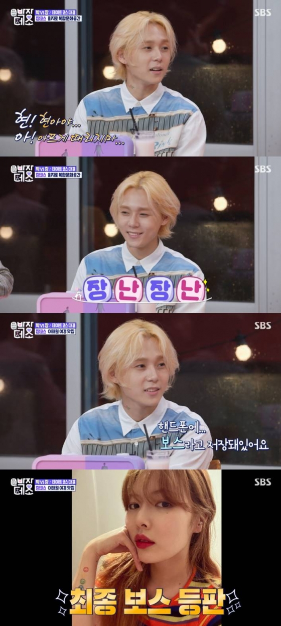 던은 '현아' 이름으로 2행시 요청을 받았다. 이에 그는 "'현'아야 '아'프게 때리지마"라며 "좀 세게 쳐가지고"라고 익살을 떨기도 했다. 이후 던은 자신의 휴대폰에 현아의 애칭으로 "'보스'라고 저장돼 있다"고 밝혀 웃음을 자아냈다.