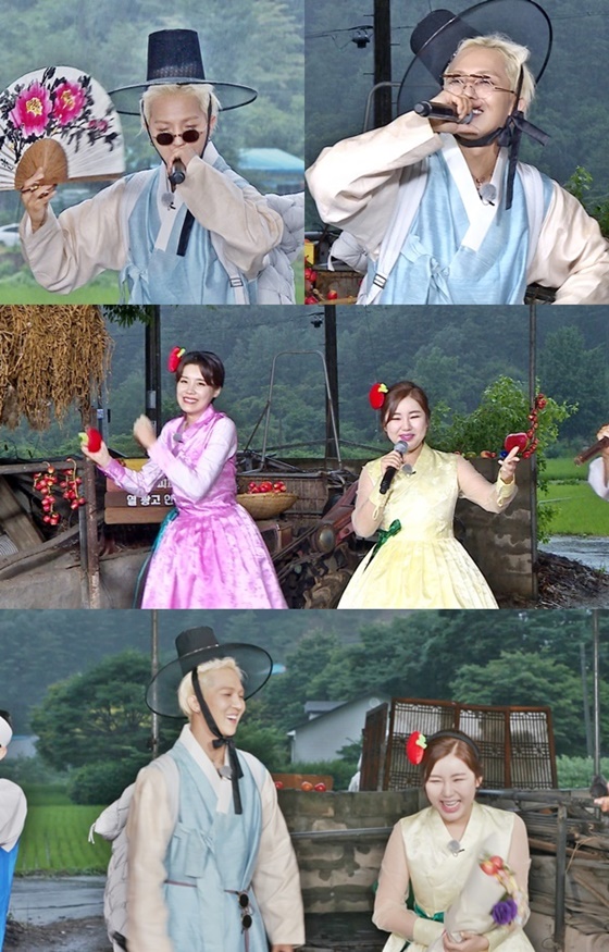 이어 '텔레그나'를 찾은 초특급 게스트 송민호. 그는 새로운 뽕힙합 장르로 화제를 모은 히트곡 '아낙네' 무대를 선보이며 깜짝 등장해 역대급 오프닝쇼로 멤버들을 놀라게 하기도 했다. 특히 송민호는 한복을 입고 갓을 쓴 채 멋진 라이브를 선보이는가 하면 "가평 사과 살리러 온 송민호여라~" 라며 능청스러운 인사로 오프닝부터 완벽히 적응한 모습을 보였다.