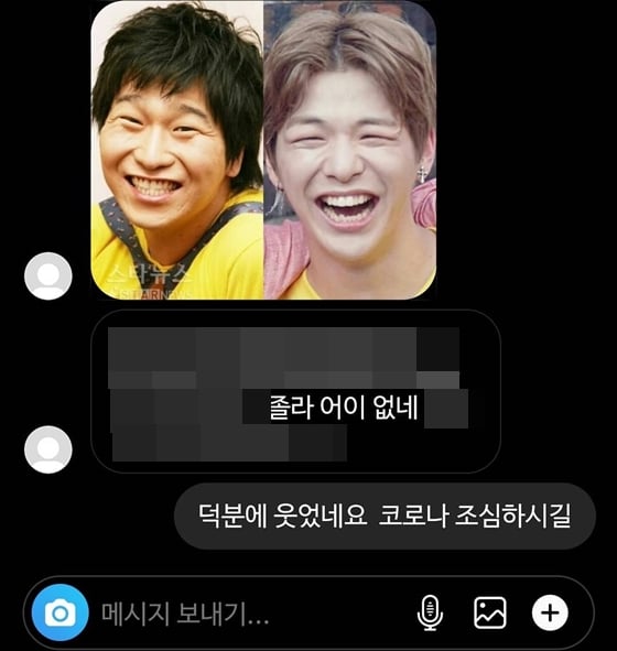 김시덕이 공개한 메시지는 강다니엘과 웃음이 닮았다는 내용의 사진이 담겨 있다. 또 이를 두고 김시덕을 향한 악플이 있어 눈살을 찌푸리게 했다. 강다니엘과 비교하는 사진을 올리는 이를 관리하라는 말 뿐만 아니라 욕설까지 담겼다.