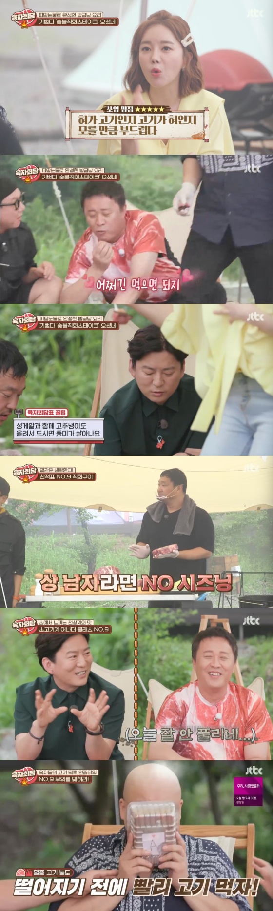 유튜버 고굽남은 고기를 구우며 자신만의 철학을 뽐냈다. 고굽남은 "시즈닝을 하지 않는다. 고기 본연의 맛을 느껴야 한다"고 말하며 고기를 썰었다. 정준하가 고기 두께에 놀라자 "엄지손가락 굵기만큼이다. 나름 과학적이다"고 설명했다. 고굽남은 옆에 있는 마늘 등의 채소를 보고 "이거 안 써도 되냐. 고기 먹을 때 채소 안 먹는다"며 자신의 고기 신념을 드러냈다.